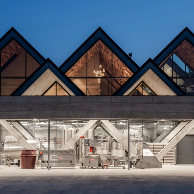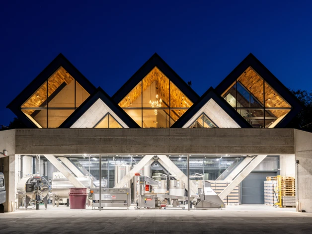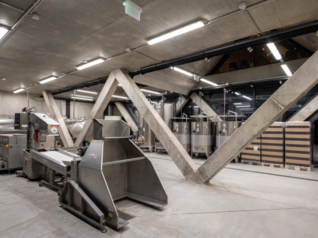 A szigorú üzemi funkciók jól integrálhatók a geometrikus terekbe. Az épületben a különböző rendeltetésű terek három szinten, logikusan elkülönítve helyezkednek el. A terepszint alatt csarnok méretű tér fogadja be az üzemi területeket, amelyeket a lejtő felől, egy gazdasági udvarról tárunk fel. Itt történik a gyümölcs feldolgozás, erjesztés. Fölötte található a kiszolgáló szint, a vendégterek, bár, fogadó- és bemutatótér, ahonnan teljes panoráma nyílik. A legfelső szinten, az átértelmezett nyeregtetők “padlásterében” irodák, kiszolgáló, üzemeltetési és gépészeti terek találhatók.