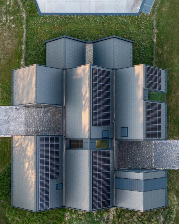 A projekt lehetőséget adott arra, hogy eljátszunk a gondolattal, hogyan lehet nagyobb tömegű épületet elhelyezni az Öreghegy oldalában, úgy, hogy az léptékével illeszkedjen a meglévő épített környezetbe. A hagyományos 45 fokos nyeregtető geometriájának vízszintes tükrözésével alakult ki a tömeget meghatározó alapegység. Ezen alapegységet vízszintesen és függőlegesen is eltolva, majd sorolva jött létre a végső épülettömeg, amelyet a lejtő esésvonalával párhuzamosan helyeztünk el az északkeleti fekvésű telek felső részén, félig a talajba süllyesztve. A rombusz keresztmetszetű „alagutak” mindkét végét üvegfallal zártuk, így teremtve kapcsolatot épület és kert között.