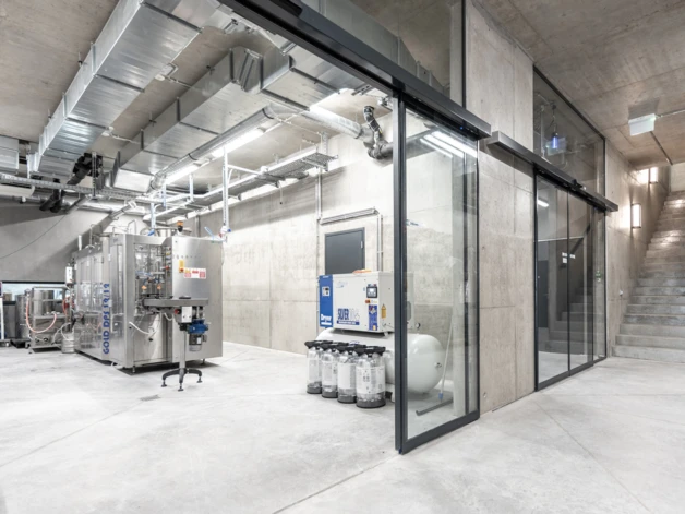 A külső megjelenést meghatározó anyagok a téglány formájú antracit kerámia cserép, az állókorcos fémlemez fedés, a vakolt felületek, az alumínium nyílászárók és függönyfalak, valamint a helyenként felbukkanó modern technológia fémes csillogása. A belsőépítészet igazodik az építészeti koncepcióhoz. Az üzemi terekben a funkcionális szempontok állnak a fókuszban, jól látható a nyers technológia, a beton szerkezeti elemek, műgyanta padlófelületek. A vendégterekben és az irodában a látszóbeton, fa, alumínium és az üveg a meghatározó anyagok. A ferde mennyezeti födémekre kettős lécvázra szerelt rusztikus faburkolat került, melyhez bontás előtt álló, gazdasági épületek szerkezeti elemei lettek újra hasznosítva. A svédpadló és a geometriához illesztett fa beépített burkolatok meleg hangulatot teremtenek a belső terekben.”
