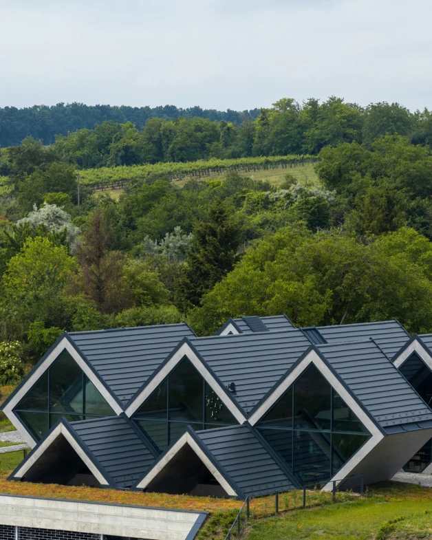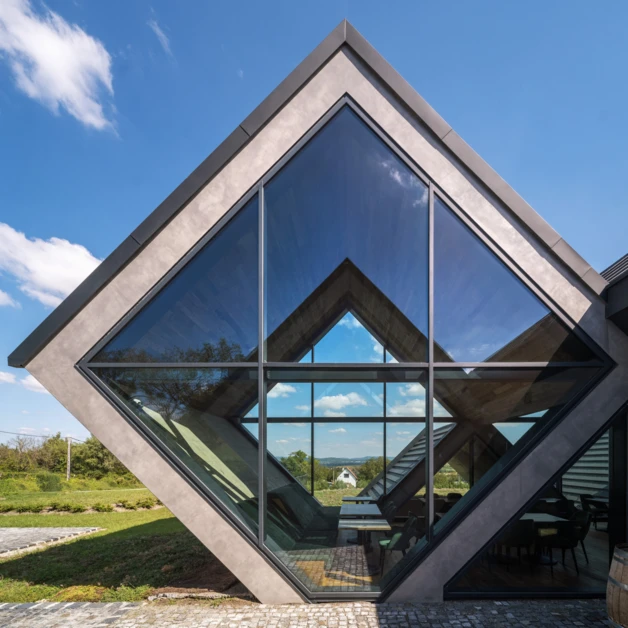 Hogy is kerül mindez ide? Mert a ma “divatos építészetre” is jellemző átlagos jegyek megtalálhatók ebben az épületben is: látszó beton felületek, szürke CREATON cseréptető… stb. De mégis az adott épületen ezek az elemek “pezsgővé” tudnak nemesülni, az adott tájegységben, az adott technológiával szervesülnek, kerek egészet alkotnak és egy kárpát-medencei, pannon táji hangulatot hoznak létre. Ahogy a Törley-ből sem lesz champagne (igazából csak a champagne-ben készült pezsgőt lehet champagne-nek nevezni), az adott épületen is fel lehet fedezni pl. a rotterdami Piet Blom Kubuswoningen-jeire jellemző élére állított “kockákat”, de itt szervesül ez a gesztus a tájra jellemző présházak apró tetőivel és ettől lesz ez több is jobb is, mint egy rotterdami építészeti “geg”. (Pedig oda is nagyon sok turista jár!) Az épület itt és most PANNON PEZSGŐVÉ nemesül.
