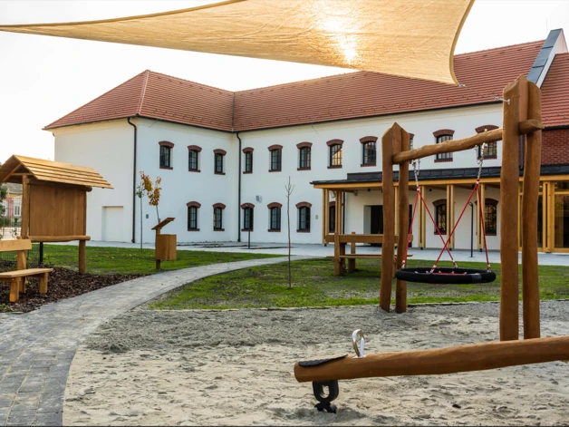 Az épület homlokzati anyagainak változása is szépen leköveti a jól felállított tervezői koncepciót, a múlt és a jelen épületrészeit a kiegészítő könnyed fa és üveg anyaghasználatú építészeti formák szővik jó arányú egységgé.