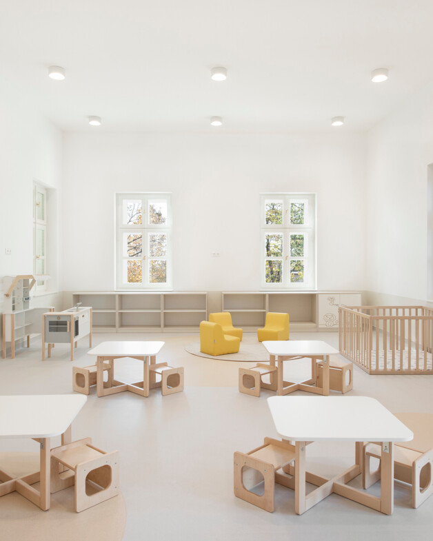 A tiszta szerkesztésű neoklasszicista épülethez értő kezekkel nyúltak a tervezők. A bölcsőde funkciót kiszolgáló új térrendszer, tökéletesen illeszkedik a szimmetrikus neoklasszicista épület belsőbe. A térrendszert pince egészíti ki, melynek felújítása egy újabb ütemben készül.