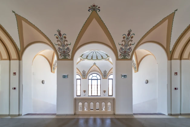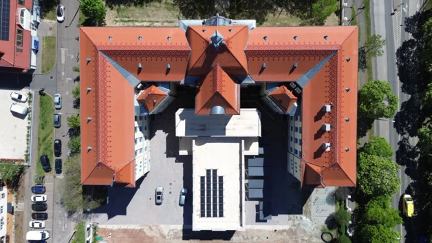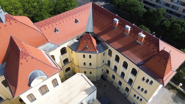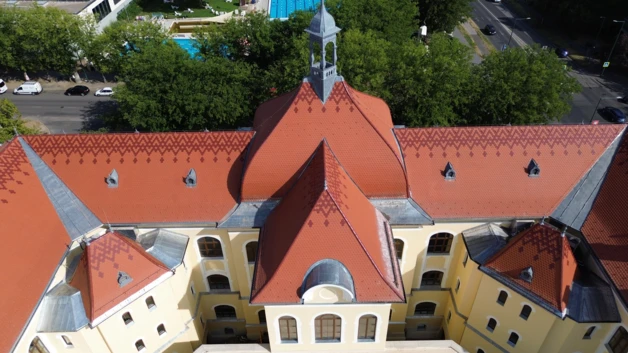 A felújítás legkarakteresebb és egyben legösszetettebb eleme az épület díszes tetőszerkezetének és fedésének rekonstrukciója. Az 1970-es években leegyszerűsített tetőformák – így az udvari toronysisakok elbontása – nemcsak az épület arányait torzították, hanem elvették annak reprezentatív, historizáló, kastélyszerű megjelenését is. A helyreállítás során az eredeti állapotokhoz való hűség volt a legfontosabb szempont Horváth Gergely és csapata számára. A kutatások és archív fotók alapján feltételezett mázas cserépfedés itt alkalmazott újragondolása akkor is zseniális, ha nem tudjuk pontosan milyen is volt ez a tető 1904-ben. Ez a sztenderd, megfizethető elemválaszték használatával létrehozott, szikár díszítés gyönyörűen rezonál a funkcióval és az épület szolid alföldi karakterével. A tetőre visszakerült, megújított bádogos elemek finoman cizellálják a látványt. A részletek precíz kidolgozottsága figyelemre méltó.
