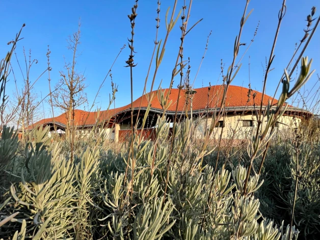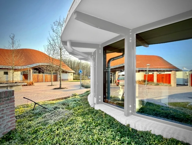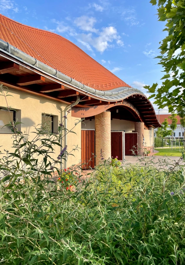 A kívánt hagyományos épületszín-világot a natúr téglalábazat, a törtfehérre festett falak és a pácolt, gyalult, látszó faszerkezetek mellett a natúrvörös cserép alkalmazása teremtette meg a legjobban, ill. szolgálta leginkább.”