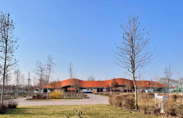 A tetőzet kontyainak megoldása sem szokványos. Az alaprajzi értelemben „kihegyezett/legömbölyített“ épületvégre lehajló, íves gerinc elfogyó vízszintes cserépsorokat produkált, mely felület a választott cseréppel ideálisan lefedhető volt.