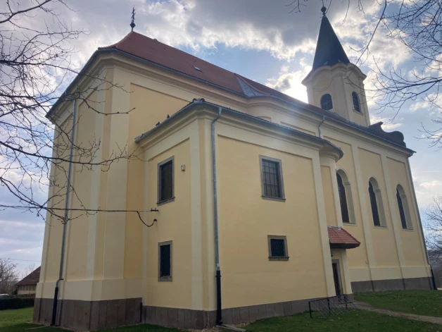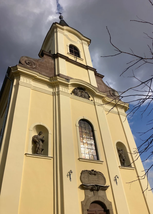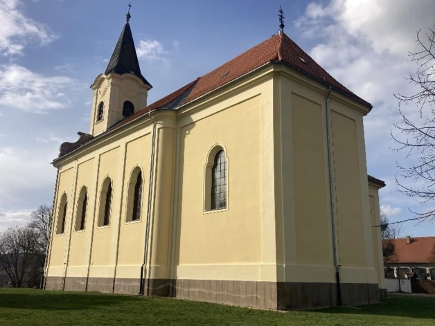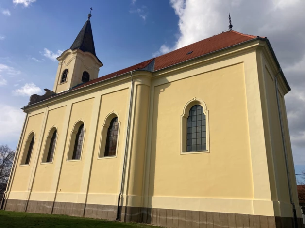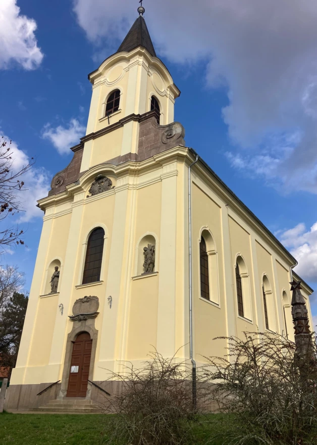 A karzatszint magasságában félköríves ablak, ettől jobbra és balra íves szoborfülkékben Szent Vendel és Szent Sebestyén kőszobrai. Középen a bejárati kapuzata tört, lapított kőkeretes, felette szépen faragott szupraportával, benne latin felirat. Egyébként jellegzetes eleme az építésznek a tört, félköríves kőkeretezés a nyílászáróknál. A templom és torony főpárkánya felett két oldalt, a közelben bányászott, barnás-vörös színű riolittufa, nyersen maradó felülettel készített, nagy csigából induló, volutás oromfal zárja le a padlásteret, az oromfal feletti osztópárkány két felső szélén hasonló anyagú, szépen faragott, rokokó váza díszíti. A torony főpárkánya órakeretes, a toronysisak terméspala fedésű gúla, lesarkított élekkel, gömb felső zárással. A homlokzatok a D-i oldalon lizénákkal tagoltak, a hajónál 4 törtíves, tagolt ablakkal, a szentély keskenyebb, rajta egy hasonló ablak található. A szentély egyenes zárású, nyílás nélküli, fedélszéke kontyolt. Az É-i oldalon a nyílászárók a hajón hasonlóak, a szentélynél emeletes sekrestyeépület készült, mellé simuló köralakú feljáró lépcső-építmény kapcsolja a hajóhoz. A tetőfedés szabvány műpalával készült, már 20. századi megoldás, károsodott, beázásokkal, cserére szorult. Ez volt tulajdonképpen az első megoldandó feladat az I. ütemben, a tetőszerkezetnek a szükséges javítási, megerősítési munkáival együtt.